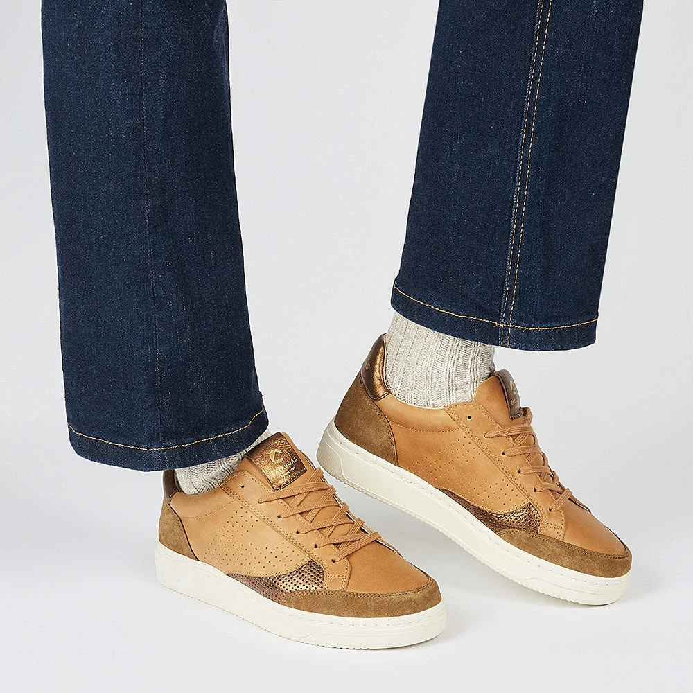 La sneaker pour femme BASALTE est revisitĂ©e cette saison avec une version fĂ©minine et Ă©purĂ©e. C’est une basket pour femme munie d’une tige en cuir lisse mixĂ©e avec du cuir mĂ©tallisĂ© et de la suède. C’est une sneaker pour femme montĂ©e sur une semelle Ă©paisse et très confortable. C’est la chaussure idĂ©ale pour allier confort et style.